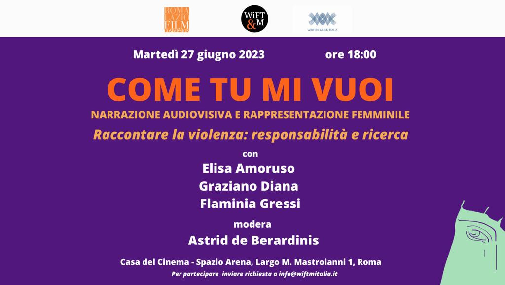COME TU MI VUOI, Narrazione audiovisiva e rappresentazione femminile è organizzato da WGI, WIFTMI e Regione Lazio Roma Film Commission.