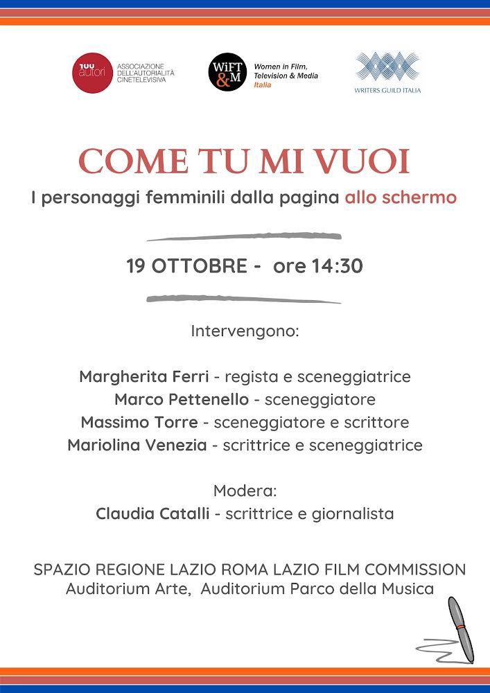 Che cosa succede a un personaggio femminile nato in un romanzo quando viene trasferito sullo schermo? Il convegno dal titolo pirandelliano Come tu mi vuoi è organizzato da WGI e WIFTMI, stavolta anche insieme all’associazione 100autori, nello spazio offerto dalla Regione Lazio Roma Film Commission nell’ambito della Festa del Cinema all’Auditorium di Roma.