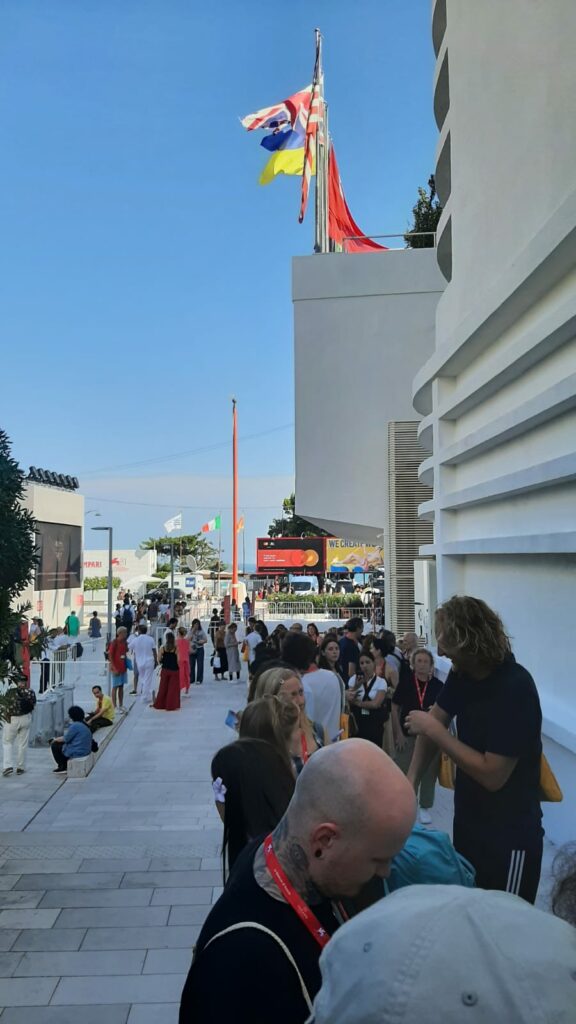 Mercoledì 28 la Mostra ha aperto le porte delle sale. Alle 9 del mattino c’era gente seduta davanti al red carpet, in attesa.