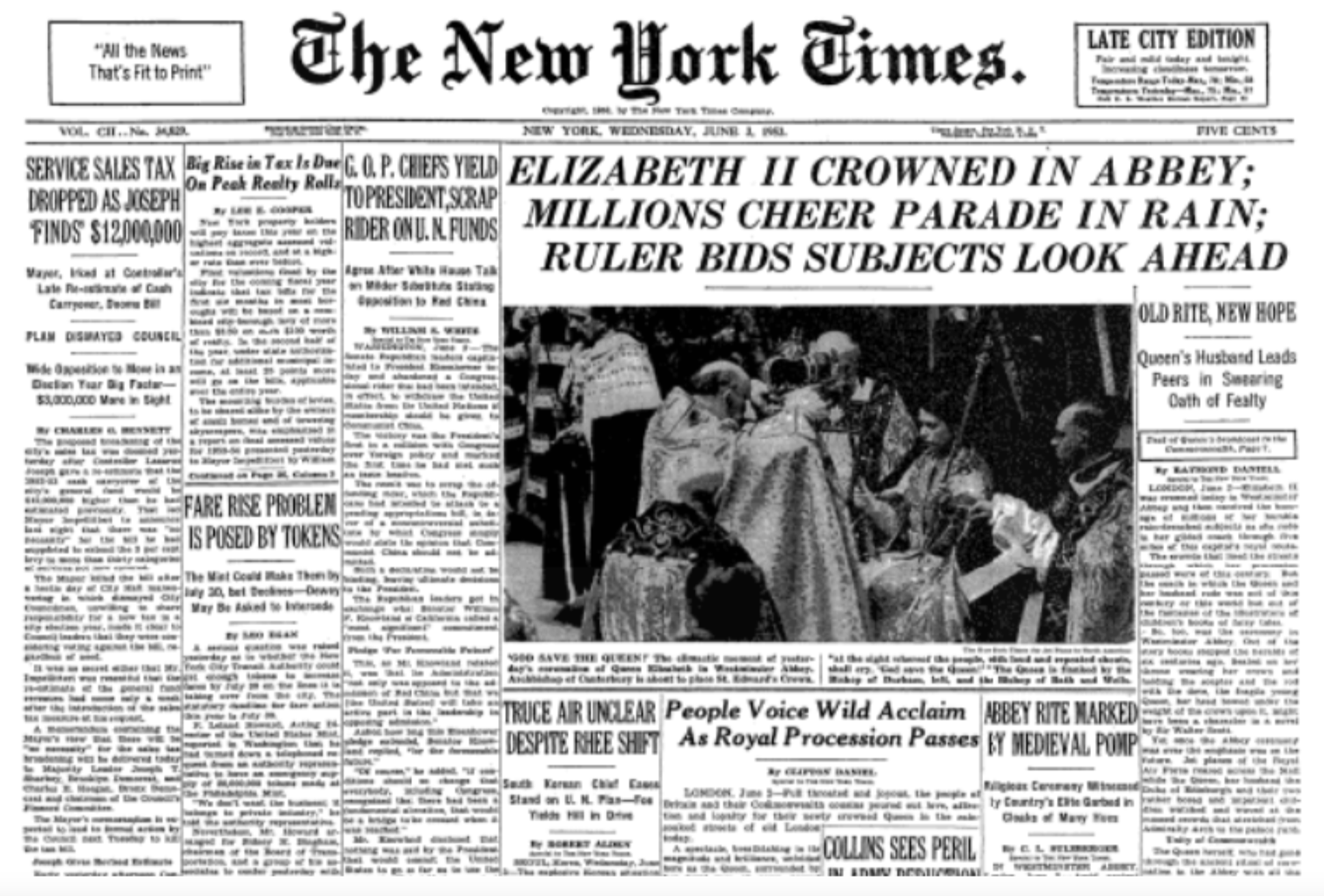 “Elisabetta II è stata incoronata oggi nell’Abbazia di Westminster e poi ha ricevuto l’omaggio di milioni di suoi umili sudditi inzuppati di pioggia mentre cavalcava nella sua carrozza dorata attraverso cinque miglia del percorso reale di questa capitale.”
