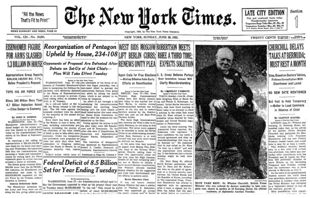 | 27 Giugno 1953. Winston Churchill ha un ictus, perciò rinvia il suo incontro con il Presidente Eisenhower alle Bermuda. |
