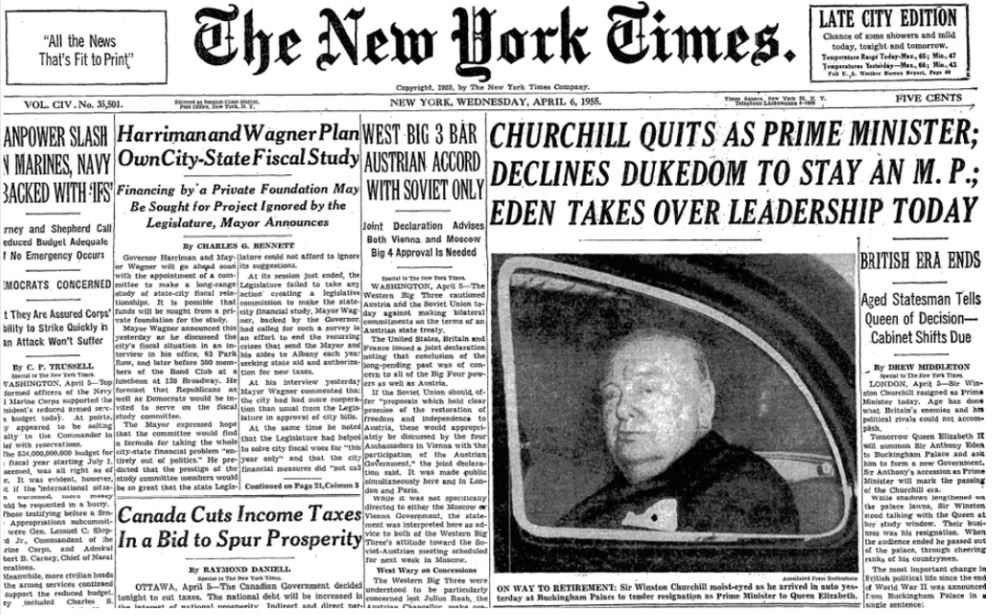 | 5 Aprile 1955. Churchill si dimette dalla carica di Primo Ministro. |
