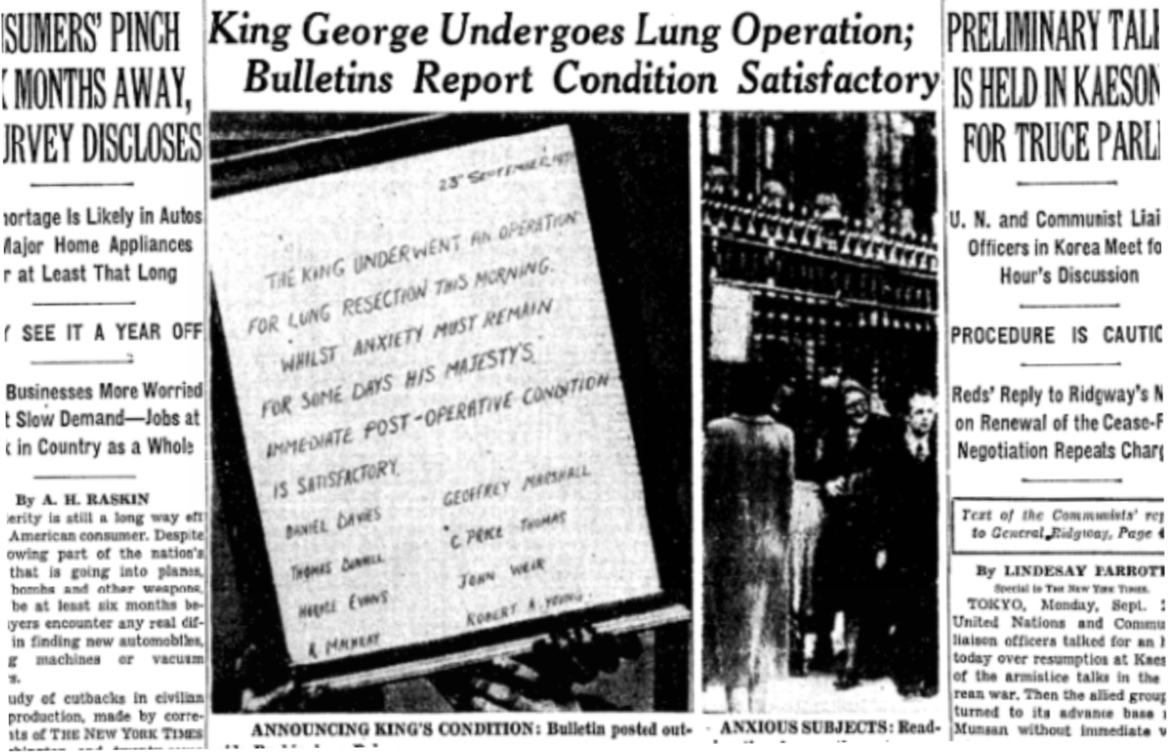 | 6 Febbraio 1952. Re Giorgio viene operato ai polmoni. | Churchill rivela a sua moglie di esser venuto a conoscenza di un tumore che ha colpito il re, promettendo di restare al governo per aiutare la Principessa Elisabetta e la nazione nel momento di difficoltà. Il re, inconsapevole fino a quel momento, viene a scoprire l’entità del suo malanno dal medico che l’ha operato ai polmoni cinque settimane prima, assieme alla possibilità di non aver più molto da vivere. |