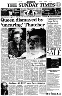 | Il Sunday Times pubblicò un articolo in cui trapelava lo sgomento della Regina per la Thatcher “indifferente” alla situazione in Sud Africa e di come, al contrario, il Primo Ministro si sentisse “schiacciato” dagli eventi. | Nonostante il Primo Ministro, dopo lunga trattativa, abbia firmato l’accordo con il Commonwealth per imporre segnali economici al Sud Africa, la Thatcher ribadisce in una conferenza stampa la diversa posizione del Regno Unito rispetto alle altre nazioni: 1 a 48. Per la prima volta, la Regina non ascolta i consigli sul suo dovere di imparzialità e chiede di far filtrare alla stampa la sua contrarietà alle posizioni della Thatcher: il suo desiderio viene esaudito. |