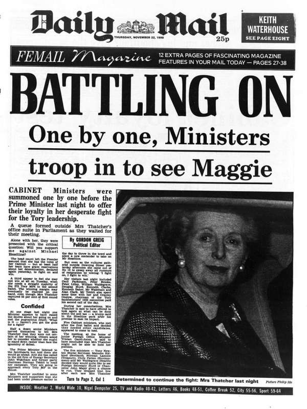 L’ex Segretario di Stato Michael Heseltine sfidò allora la leader del partito conservatore. Il 20 novembre si svolse il voto della direzione dei Tory e Margaret Thatcher ottenne 204 voti su 372, mentre il suo sfidante ne raggiunse 152. Purtroppo, per il regolamento del partito non era un vantaggio sufficiente per nominarla ancora una volta leader. Il 27 novembre la Thatcher decise allora di ritirarsi dalla corsa, rinunciando a guidare il Partito Conservatore e rassegnando le dimissioni da Primo Ministro del governo britannico. |