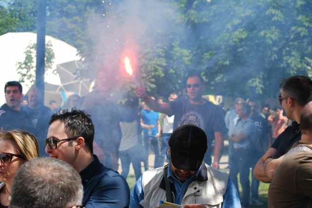 Esplodono bombe carta: l’effetto sonoro è perfetto, l’acustica promette bene per il dj-set. L’incontro su wikileaks inizia in ritardo, le due speaker sono un po’ nervose. I megafoni scatenano cori di slogan e nuovi petardi fanno tremare la tensostrutturina, in cui siamo un po’ stipati, come polli in una serra. Decido di uscire.
